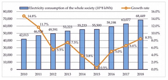 The global energy shortage has become an increasingly serious problem, and there is continual pressure to reduce carbon emissions [1]. In order to improve energy efficiency, countries around the world are actively taking countermeasures. With the deepening of energy supply-side structural reform in China, the survival and development of traditional thermal power generation enterprises will face more severe challenges. In terms of the macro-economy, China’s is still under considerable downstream pressure, consumption growth is slowing, and the increase in electricity consumption of the entire society has been limited. The average increase in electricity consumption in China was only 4.9% from 2014 to 2018, as shown in Figure 1.