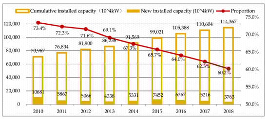 New installed capacity, cumulative installed capacity, and proportion of thermal power generation in China, 2010–2018 (Data source: China electric power yearbook).