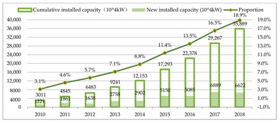 New installed capacity, cumulative installed capacity, and proportion of wind and photovoltaic power in China, 2010–2018 (Data source: China New Energy Power Generation Analysis Report).