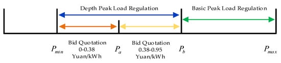 The main participants in the peak load regulation auxiliary market are grid-connected power plants (including public thermal power plants, wind power plants, photovoltaic power plants, and hydropower stations with an installed capacity of 50 MW and above), electricity storage consumers, and interruptible load consumers (who have been admitted to enter the market). Peak load regulation service falls into two categories: basic (obligatory) peak load regulation, and paid peak load regulation. Paid peak load regulation is traded on the electricity auxiliary service market, including real-time deep peak load regulation, mediation standby transactions, interruptible load transactions, and electricity storage transactions. We mainly studied deep peak load regulation. The income generated by thermal power units participating in deep peak shaving can be expressed as the product of the trading electricity quantity and the clearing electricity price: