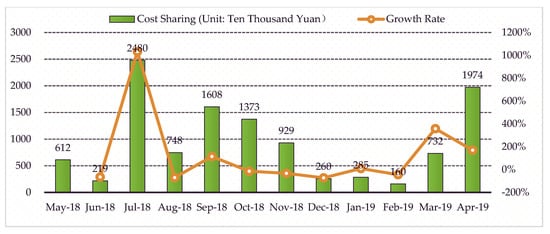 According to the Notice on announcing the compensation allocation of Ningxia electric power auxiliary service market (NCERB), the corrected quantity of electricity was 5,829,820 MWh and the total apportioned cost was 113.79 million yuan for one year since the peak load regulation market began operation in May 2018 [44]. The monthly data of the corrected electricity quantity and the peak shaving cost-sharing are shown in Figure 5 and Figure 6. Model detail parameters can be seen in Table A1.