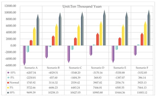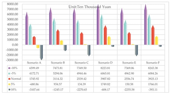We then analyzed the impact of changes in on-grid electricity tariff on profits by assuming that other factors were unchanged. The on-grid electricity tariff was also obtained with change proportions of −10%, −5%, 5%, and 10%, and the profit value in each scenario with different change proportions of on-grid electricity tariff were calculated using the equations in Section 3.3. The result is shown in Figure 9.
