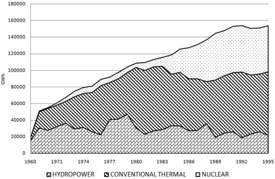 Evolution of Spanish electricity generation by technology, 1960–1995. Source: based on UNESA’s annual reports.