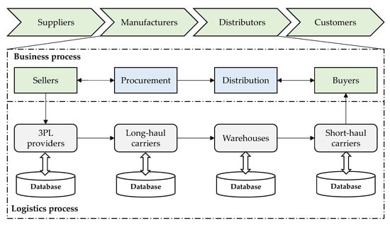 Logistics in supply chains is the management of the flow of goods between the point of origin and the point of consumption in order to meet requirements [55]. As shown in Figure 1, a typical supply chain consists of suppliers, manufacturers, distributors and customers. An upstream stakeholder can be regarded as a seller of its downstream stakeholders. Therefore, in the business process, upstream stakeholders can be abstracted as sellers and downstream stakeholders can be abstracted as buyers. For example, manufacturers are sellers of distributors. When buyers purchase goods from sellers, there are at least two procedures, including procurement and distribution. After placing an order successfully, sellers will arrange a third-party logistics (3PL) provider to transport goods. In most cases, multimodal transport is used. Transportation contains long-haul transport, warehousing and short-haul transport. Finally, goods are delivered to buyers and the transaction is completed. In the logistics process, stakeholders need to collaborate and coordinate together to complete transportation tasks. To realize collaboration and coordination, stakeholders need to use real-time data and information so that optimal solutions and decisions can be made to realize green logistics.