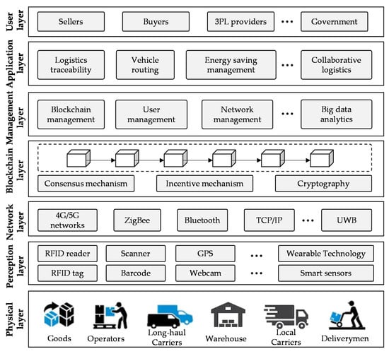 The application layer provides diversified applications, such as logistics traceability, emission analysis, smart transactions and collaborative logistics for users in the user layer. Users refer to stakeholders related to logistics in supply chains.