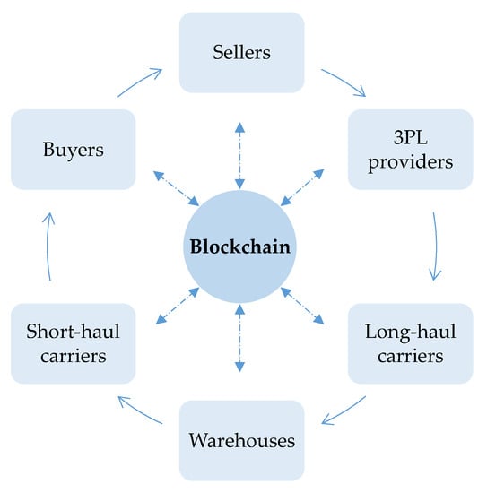 The applications of blockchain technology can have a great impact on logistics management [10]. Blockchain was conceived in 2008 and first applied to the financial application Bitcoin [11]. Recently, blockchain has been applied to other research fields, such as manufacturing [12] and “smart” city development [13,14]. In this context, the use of this technology for logistics is a topical research field as blockchain guarantees the reliability and immutability of data that are open to the public [15]. For example, in the telecommunications industry, blockchain enables the transparency and reliability of sharing network traffic, income or other forms of economic compensation, which can create economically sustainable internet access. Each participant can invest in resources to recover the economic costs of network equipment and maintenance [16]. In the aviation industry, the major implications of blockchain technology for operations management have been investigated and links between blockchain technology, operations management and sustainability issues within supply chain management have also been analyzed. However, there is a lack of a network or framework to ensure the best results in terms of effectiveness, efficiency and sustainability [17]. Most research focuses on exploring the policies, opportunities and barriers to blockchain in the logistics industry, overlooking how to apply blockchain to logistics.
