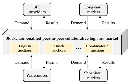 Collaborative logistics. This application enables logistics companies to collaborate with each other to serve a set of customers while reducing freight logistics costs and maximizing capacity utilizations of facilities [59]. This collaboration among logistics companies can reduce energy consumption and carbon emissions, and increase profitability. Generally, there is a collaborative logistics market with multiple agents who want to trade their logistics resources or logistics tasks. Due to dynamic demand and supply, traditional collaborative logistics markets find it difficult to allocate logistics resources and tasks. By adopting blockchain technology, a P2P collaborative logistics market can be established, which allows them to trade freely, as shown in Figure 4. This application not only maximizes the allocation of resources, but also reduces the consumption of raw materials, thus improving the environment, promoting sustainable development and the formation of green supply chains. In blockchain-enabled P2P markets, smart contracts can be used to facilitate the trading process. Agents use smart contracts to set trading protocols, and auction methods such as English auctions, Dutch auctions and combinatorial auctions can be used to build collaborative relationships. Once conditions are satisfied, trading can be completed successfully.