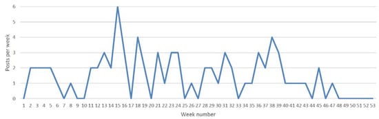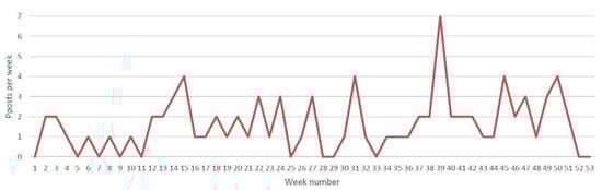 In order to depict a comprehensive overview of the Facebook activity by the University, we also analyzed the frequency of posting per week (Figure 1 and Figure 2). The results show a low posting activity with the University publishing on average a total of about three posts per week (less than one post per day). In their study on the effect of posting frequency on users’ engagement, Mariani et al. [62] found that high post frequency (more than five posts per day) negatively influences engagement level but at the same time posting one or two posts per day has a positive impact on engagement itself. Accordingly, the University should enhance the frequency at which published posts on sustainability in its official Facebook pages.