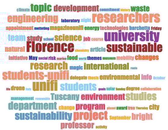 More precisely, we explored the case of the University of Florence (hereinafter, also simply referred to as “the University”). Several reasons support this choice. First, this institution is among the 10 largest Italian universities, having more than 52,000 students enrolled, about 3200 academic and non-academic staff, and approximately 280 educational programs. Second, it is one of the signers of some important declarations in the sustainability field, such as The Magna Charta Universitatum and Copernicus University Charter for Sustainable Development [53]. Third, it ranks fourth (alongside the University of Parma) among the Italian higher education institutions in the University Impact Ranking 2019 drawn up by the international weekly magazine Times Higher Education. Last but not least, the University has a Facebook page (Unifi: Sustainable University) as well as a website (www.ateneosostenibile.unifi.it) entirely dedicated to the topic of sustainability. This is particularly interesting since, as Hamid et al. [21] pointed out, universities may enhance their legitimacy about sustainability communication by creating a social Facebook account specifically devoted to disclosing information about green initiatives of the institution. Furthermore, the University of Florence, in their strategic plan for 2019–2021, stated that communication through social media is one of the main channels for fostering the University’s research results, teaching information, and organizational data. Based on this, the University of Florence may be considered as a very interesting case to explore sustainability issues in a wide academic community.