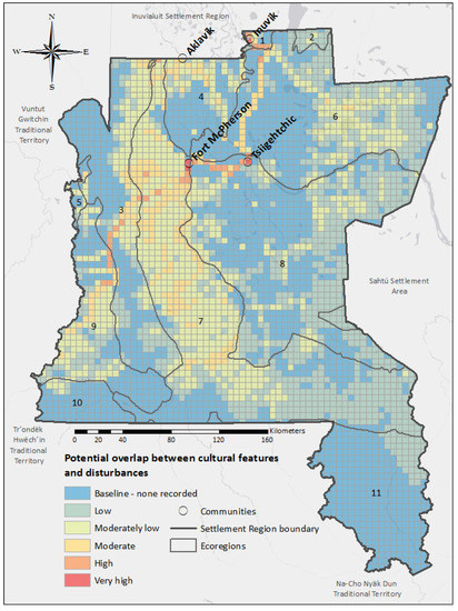In this study, we explore the potential of spatial overlay analysis to quantify and map the potential overlap between environmental disturbances and cultural features in the Gwich’in Settlement Region (GSR). Areas of overlap identify places where cumulative impacts may damage, destroy, or alter cultural features, and impact cultural practices like subsistence harvesting and travel. Our analysis provides a snapshot of regional cumulative environmental impacts occurring in the Gwich’in Settlement Region, and details a planning tool that can be used by cultural and natural resource managers in the midst of rapid, regional changes.