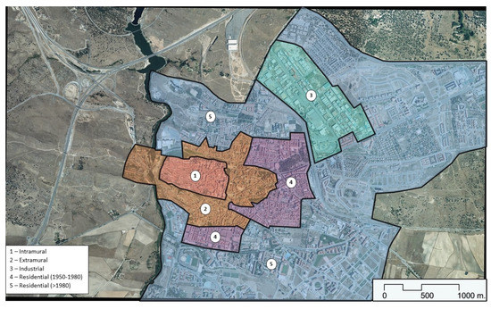 The urban framework of the city (Figure 1) was established considering five different sectors (Figure 1): (i) the intramural sector which encloses the historical center and is bordered by the medieval wall of Avila; (ii) the extramural sector surrounding the intramural sector; (iii) the industrial sector which spreads out in the east of the city; (iv) the old residential sector (1950–1980) beside the extramural sector in the east and south parts of the city; (v) the modern residential sector (1981–2017), which is spread out along the peripherical part of the city, especially towards the south and east.