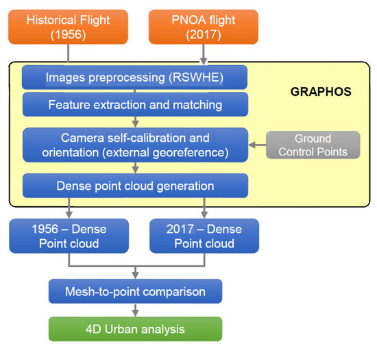 Three main steps were followed to study the urban growth in the city of Avila between 1956 and 2017 (Figure 3): (i) the generation of dense point clouds from both flights, (ii) the comparison of the georeferenced 3D models, (iii) an urban growth analysis.