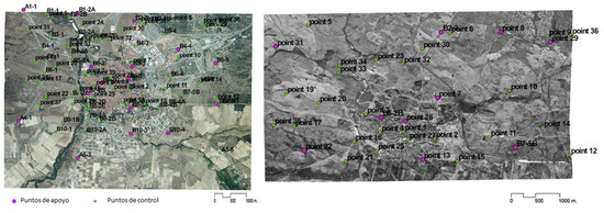 During the absolute orientation, several GCPs and GChPs were used with the aim of georeferencing the final product and assessing the accuracy, respectively (Figure 5). Regarding the PNOA flight, 16 GCPs and 25 GChPs were used. These GCPs and GChPs were surveyed with the Leica 1200GPS system using the real time kinematic (RTK) approach and taking the European Terrestrial Reference System 1989 (ETRS89) and the Universal Transverse Mercator (UTM) 30N projection as a reference system and national map projection, respectively. A total of 10 GCPs and 26 GChPs were used for the historical American flight.