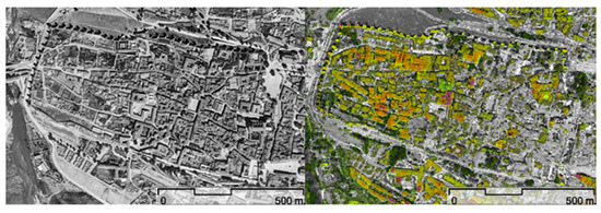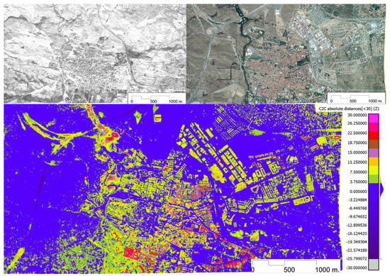 Beginning with the two photogrammetric point clouds (1965–2017) previously obtained, an analysis of the urban growth of the city of Avila, based on height discrepancies, was carried out (Figure 7). To this end, the following approach was applied: (i) extraction of the area of overlap between both point clouds, (ii) comparison between the PNOA point cloud and the mesh generated from the American flight point cloud, and (iii) classification by height.