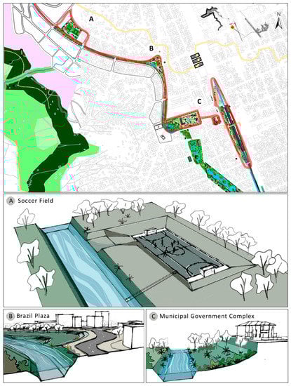 Therefore, it is possible to integrate sustainable urban drainage measures with urban design, working in landscape compositions that respect the historical and cultural vocations of a watershed, to produce a low-impact urban development, with participation and acceptance of city communities [26], capable of generating appropriate conditions for sustaining river restoration measures associated with a river corridor, which, in turn, appears as an alternative to recover the river–city relationship [21] and a practical and effective solution for the critical problems of urban floods.