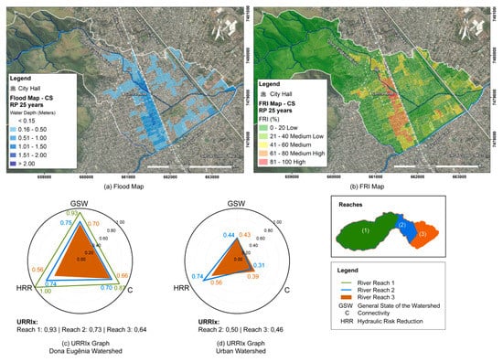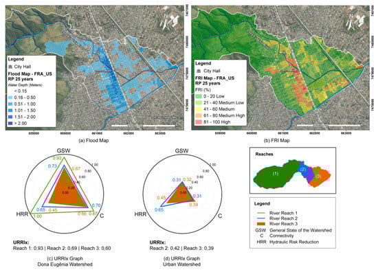 Current Situation Evolving to Urban Saturation (FRA.US)—25-year RP (a) Flood map; (b) FRI map; (c) URRIx results for the whole watershed; (d) URRIx results for the urban watershed—2nd and 3rd reaches of Dona Eugênia Watershed.