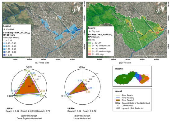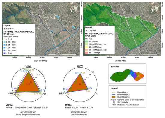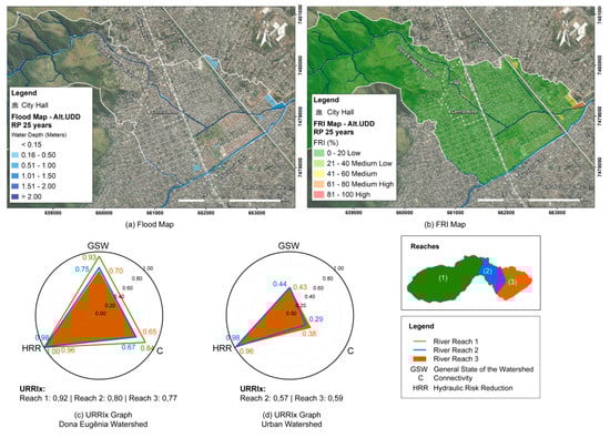 Usual Drainage Design Alternative Under Urban Saturation (FRA_Alt.UDDUS)—25-year RP (a) Flood map; (b) FRI map; (c) URRIx results for the whole watershed; (d) URRIx results for the urban watershed—2nd and 3rd reaches of Dona Eugênia Watershed.