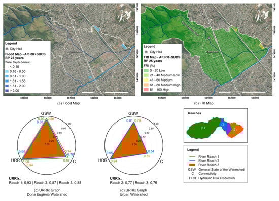 River Restoration + Sustainable Urban Drainage Alternative Under Urban Saturation (FRA_Alt.RR+SUDSUS)—25-year RP (a) Flood map; (b) FRI map; (c) URRIx results for the whole watershed; (d) URRIx results for the urban watershed—2nd and 3rd reaches of Dona Eugênia Watershed.