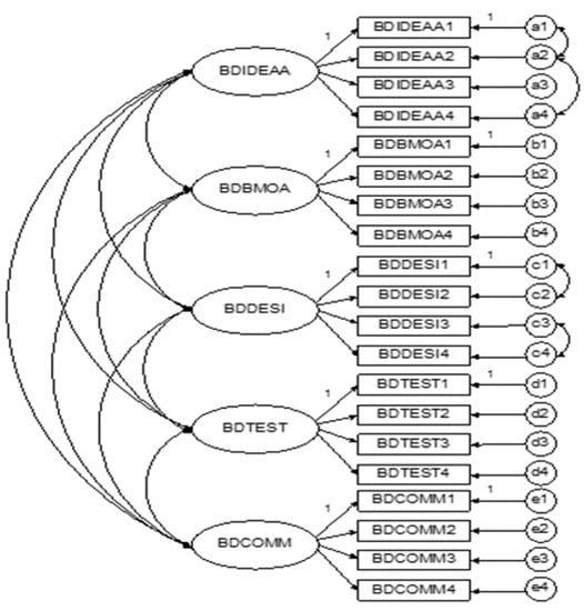 We performed a confirmative factor analysis (CFA) to validate the measurement model fit using AMOS software []. The initial measurement model for each country was run by using all measures. The fit indices and modification indices suggested that the initial models can be significantly improved by adding four correlations among four errors of the four measures (as shown in Figure 2): (1) the error term of BDIDEAA2 should be correlated with the error term of BDIDEAA1 and BDIDEAA4 respectively, (2) the error terms of BDDESI1 and BDDESI2 should be correlated, and (3) the error term of BDDESI3 and BDDESI4 should be correlated. Table 2 presents the relevant statistics of the final measurement models for all three countries.
