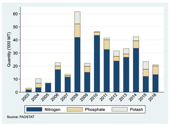 Figure 1 also illustrates that nitrogen was undoubtedly the most consumed fertilizer during the period 2003 to 2016, followed by phosphate and potash. Nitrogen accounted for 74.1% of the total fertilizer consumed over the period 2003 to 2016, phosphate for 15.3%, and potash for 10.6%. However, there was considerable variation from year to year. Over the period 2003 to 2016, the share of total fertilizer consumption accounted for by nitrogen ranged between 32.8% in 2004 and 93.6% in 2010; the share accounted for by phosphate ranged between 5.6% in 2010 and 41.1% in 2003; and the share accounted for by potash ranged between 0.8% in 2010 and 33.7% in 2004. The popularity of nitrogen fertilizer is likely a result of the general fertilizer mix (availability) in Mozambique, as well as the types of crops on which it is used [12]. These authors also argued that fertilizer in Mozambique comes as NPK 12:24:12, as well as urea (46% N) and others, but the latter are the most available.