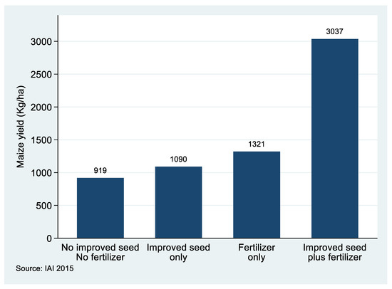 Figure 3 shows that maize yield stood at 1090 kg ha−1 among farmers who used improved maize seeds but did not use fertilizer, compared with 1321 kg ha−1 among farmers who used fertilizer but did not use improved maize seeds and 3037 kg ha−1 among farmers who used both improved maize seeds and fertilizer, suggesting complementarity between fertilizer and improved seeds.