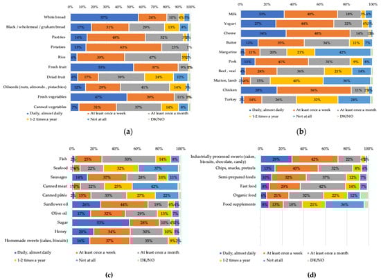 Frequency of food consumption: (a) first list of items; (b) second list of items; (c) third list of items; (d) fourth list of items.