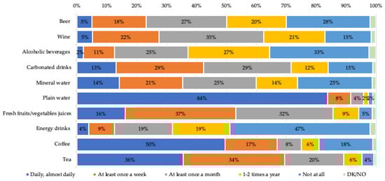 Regarding the consumption of healthy drinks, we can notice a high consumption of plain water, as well as an average consumption of tea (Figure 3).