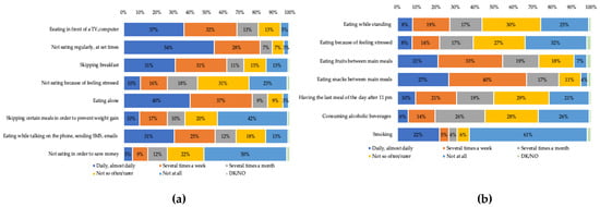 Another aspect analysed in terms of sustainable consumption behaviour is conviviality. For this reason, certain eating practices were analysed (Figure 4a,b), notice the existence of a high percentage of students who eat alone, who do not eat regularly, and who carry out other activities while eating (watching TV, talking on the phone, sending SMS, emails). The average consumption of snacks and fruits between meals was identified. Other analyses of eating habits and lifestyle reveal that a quarter of respondents eat after 23:00. Almost half of the respondents consider that their eating habits are neither healthy nor unhealthy. The main reason why they eat healthily is to maintain their health and to prevent certain diseases, and one of the main reasons why they do not eat healthily is the lack of time. Half of the sample is normal weight; only 17% are overweight.