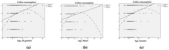 Correlation between age, gender, and coffee consumption (Regression lines): (a) all genders; (b) males; (c) females.