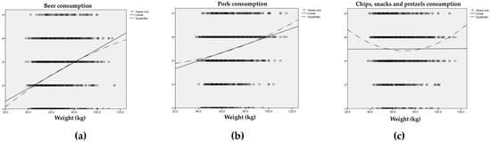 Correlation between weight and consumption of beer, pork, chips, snacks, and pretzels (Regression lines): (a) beer; (b) pork; (c) f chips, snacks, and pretzels.