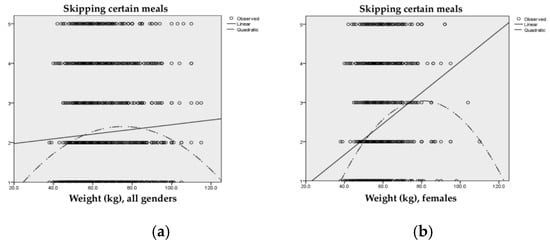 Correlation between skipping meals and weight (Regression lines): (a) all genders (b) females