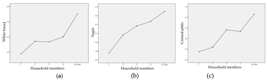 Correlation between the number of household members and the consumption of white bread, sugar, and canned pâtés: (a) white bread; (b) sugar (c) canned pâtés.