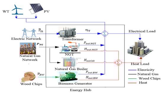 Figure 2 shows the formation of the examined energy hub system. In this framework, in addition to the inputs of the wind and solar energy carriers, the consumed electrical and biomass, and natural gas energies are converted to electrical and heat energy to fulfill load needs. The energy hub consists mainly of biomass generating units and natural gas turbines with the assimilation of WTs and PVs. In addition to the conventional boiler, it is utilized to compensate the inadequate heat requirements. The steady-state of the multi carrier’s hub framework is represented as follows:
