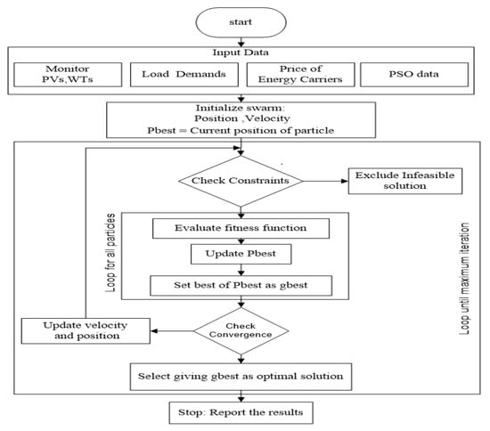 In this study, we need to evaluate the proper scheduling of one day, which is subdivided into 24 time intervals. Figure 3 shows the essential stages of the PSO algorithm used in this analysis. The main procedures of the proposed solution method are described as follows: