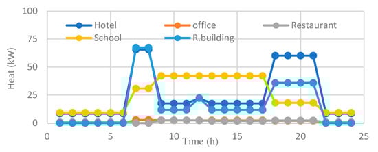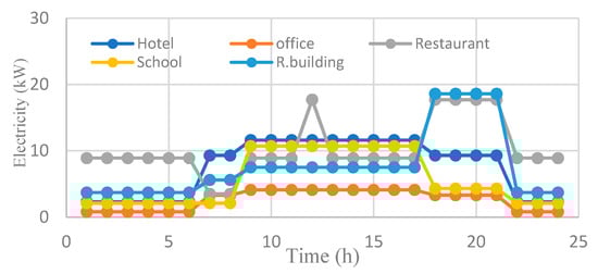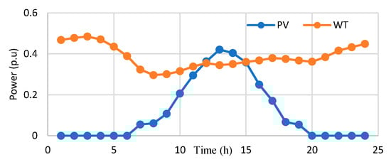 In this study, the energy hub serves five local sites, including campus restaurant, office building, 100 residential, school campus, and hotel. The electricity and thermal load demands of one typical day are illustrated in Figure 4 and Figure 5, respectively [29]. Figure 6 shows the p.u output power from PVs and WTs for one typical day. Table 1 and Table 2 present the energy hub parameters and the price of electricity used for estimating the running cost and CO2 emissions. The multiple energy hub is equipped with NGT, biomass generating unit, PVs, and WTs with an electrical capacity of 1900, 1900, 500, and 500 kW, respectively, whereas the thermal capacity of NGT and Biomass generating unit is 2600 and 4500 kW, respectively. The hub system is studied with and without the integration of renewable energy sources. In addition, a comparison between three cases, including single objective functions of operating expenses of the hub and total carbon emitted from the hub, and the multi-objective function of the operating expenses and carbon emissions are studied. The optimum energy hub construction and planning are achieved using a PSO algorithm for single and multi-objective functions. Table 3 shows the configuration of the studied systems. Three main objective functions are considered during the analysis of each configuration of the hub system including lessening the gross running cost (F1), lessening total system emissions (F2), and compromised solution (F3). F3 represents the compromised balanced solution (both total system expenses and CO2 emissions are used to evaluate (F3)). Instead of using a weighted sum method to obtain a single objective function, the utopia point method is used to minimize the distance between the compromised solutions and an ideal solution by using Equations (13)–(15), where the optimum solution of F1 is used to find the minimum band of the total operating expenses () and the maximum band of the total system emission (). Meanwhile, the optimal solution of F2 is used to find the maximum band on the total operating cost () and the minimum band of the total system emission ().