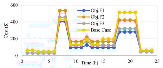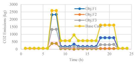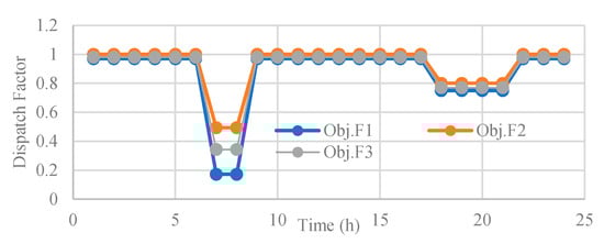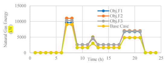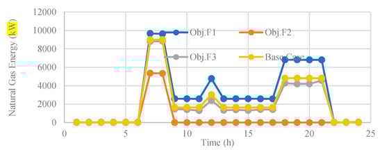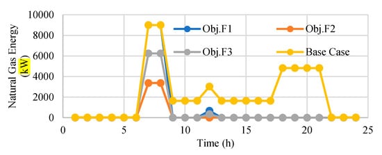 Figure 7 shows the dispatch factor used to estimate natural gas usage. The response with objective F1 indicates the lowest dispatch factor values compared to F2 and F3 cases. Therefore, the conventional boiler consumes more natural gas to fulfill the thermal load requirements at a reasonably low price regardless of the quantities of CO2 released from the system. The natural gas boiler’s heat conversion efficiency is much greater than NGT, thus, producing more heat compared to NGT, with less amount of fuel and low price. On the other hand, the F2-based energy hub has the greatest dispatch factor values. The hub maximizes the environmental benefits from generating higher quantities of thermal energy from NGT and reduces the reliance on the boiler as it releases more carbon emissions relative to NGT. The natural gas energy trading with the natural gas supplier is shown in Figure 8. It is observed that the quantities of natural gas fuel used in the three cases are much considerably higher than that of the base case. Besides, for objective function F2, higher quantities of natural gas are utilized compared to the F1 and F3 objective cases. This is due to NGT using more fuel to generate the requirements of the load with the lowest level of emissions and reduces reliance on the boiler. Consequentially, further electrical energy is delivered to the utility grid with objective function F2 compared to other objective functions (F1and F3), as shown in Figure 9.