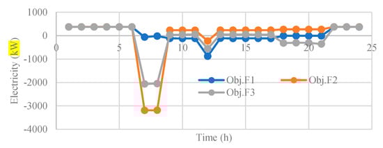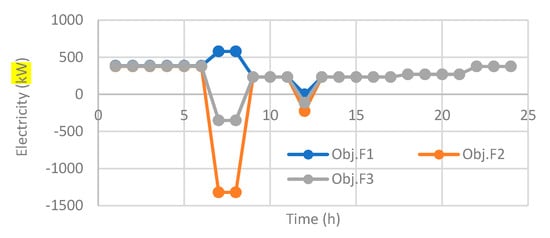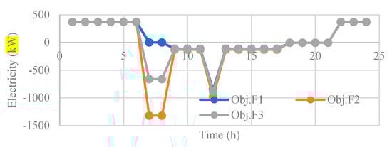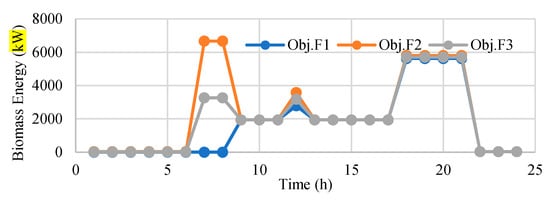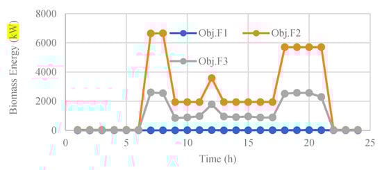 The multi-carrier hub system in this configuration fulfills its load demands with the aid of a conventional boiler fueled by natural gas and a biomass generating unit beside the connection with the electrical network grid. Table 6 presents the outcomes of the optimum management problem. Energy hub system design using objective F1 is the most economical system, as it introduces a 10.2% drop in the hub’s operating expenses in comparison to the base case, whereas using F2 and F3 provides 5% and 7.8% reduction in the total operational cost of the system, respectively. On the other hand, energy hub system design with F2 introduces the lowest level of CO2 emission; it introduces an 84.1% reduction in the overall system emission relative to the base case, whereas objective F1 and F3 introduce 64.2% and 74.4% CO2 emissions reduction, respectively. The most significant quantity of natural gas is drawn from the supplier when the hub system is designed based on objective F1, as shown in Figure 10. This is because the purchasing cost of natural gas is lower than the biomass fuel. Furthermore, based on objective function F2, less quantity of natural gas fuel (as in Figure 10) and more quantity of biomass wood chips fuel (as in Figure 11) used to maximize the environmental profits of the hub system. Figure 11 shows that the F2 objective poses an additional burden on the operation of the hub system because the biomass unit at 6.00 a.m. ramps its operation to full capacity to achieve electrical and thermal load demands and in this case, the largest amount of wood chips biomass, equivalent to about 6000 kW, is consumed at the hub system input port. Finally, using the multi-objective function F3 for scheduling the hub system reflects the median solution as the overall operating expenses plummeted by 7.8%, and the whole carbon emissions dropped significantly by 74.4% in comparison to the base case. Figure 12 shows using objective function F2 results in further electrical energy offered to sell to the utility grid, while using objective F1 results in more electricity purchased from the utility grid.