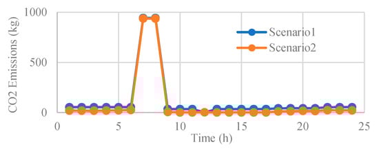 Moreover, in the F2 case, the operational expenditure of the third configuration increased only 3 USD, compared to the same case in the second configuration, to achieve a 39.5% reduction in CO2 emissions. This is because the hub mainly depends on the biomass generating unit and NGT to produce most of the energy required by the load demand. As indicated in Table 7, a minimal amount of heat, about 8 kWh, is generated by the conventional boiler during this case, whereas the boiler generated more than 5 MWh in the same case of the second configuration to supply the deficient heat. Case F3 in the third configuration signifies the intermediate solution compared to the same cases in the first and second configurations. It introduces boosting of 16.4% and a reduction of 18% in total operating costs compared to the same cases in the first and second configurations, respectively. Moreover, it introduces boosting of 18.6% and a reduction of 44.2% in total CO2 emissions compared to the same cases in the first and second configurations, respectively. Comparing the outcomes of the three examined configurations in the first scenario shows that the third configuration represents the optimum combination of multi-energy hub construction. The energy hub can gain more economic and environmental profits from using mixed combination of biomass generating unit and NGT by mitigating both: overall operating expenses and CO2 released from the hub. Moreover, biomass is a clean source of energy, but it is expensive compared to natural gas.