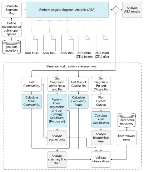 This paper conducts a qualitative validation of a method for the resilience analysis of urban street networks, based on Space Syntax analysis techniques. To this end, it uses information on two comparable—and yet, in some respects, different (see Section 5.1)—Italian bridge crashes. The impacts of the two bridge disasters are compared by simulating the effects of the sudden removal of one central node (i.e., the bridge) from the dual graph representation of the corresponding street network systems. As illustrated in Figure 1, the method encompasses two steps, namely a diachronic Angular Segment Analysis (details in Section 3.1) and, subsequently, a street network resilience assessment (details in Section 3.2) based on the retrieval of four main resilience indices (Section 4) for a selection of time steps. Here, we look at the grid transformations during the expansion of the two cities from 1840 to the present, as this allows identifying some of the preconditions of the faster and lengthier post-disaster recovery experienced by Bologna and Genoa, respectively. The diachronic approach allows for the integration of the dimension of time in the resilience assessment via the identification of tipping points in the urban evolution process, shifting street network configurations to more (or less) resilient configurations. Due to their representativeness and practical issues of data availability, the following dates were selected for the analysis: 1840, 1890, 1940 and 2018—before and after the bridge collapse. The geometric 2D inputs used for the study are closed polylines, which were traced in ®AutoCAD over official cartographic data or high-resolution images of historic town maps.