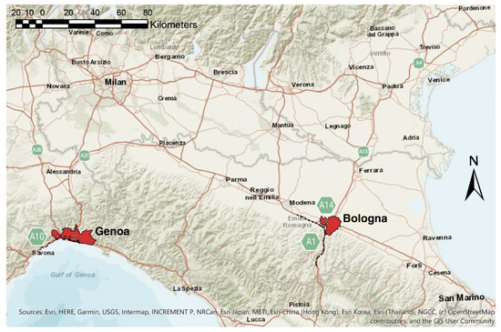 As shown in Figure 2, the research analyses the street network of the municipalities of Genoa and Bologna. These cities are both hubs of primary importance within the Italian transportation network, and in each of them the motorway is a key component of the road network structure. On 6 August 2018, an overpass of the motorway bypassing Bologna collapsed because of a large and sudden fire triggered by a disastrous car accident. Although fortuitous and favourable circumstances helped limiting the final death toll to two people, the disaster caused injuries to many, provoked the destruction of hundreds of vehicles, serious damages to buildings across a large area as well as lengthy disruptions of traffic, which led to the crisis of the North Italy motorway network. On August 14, only 200 kilometres away from the first disaster, the Polcevera bridge (also known as the Morandi bridge), which served the motorway passing through the metropolitan area of Genoa, collapsed due to causes that are yet to be fully clarified. The consequences of this crash were far more serious (43 victims were buried under the bridge’s ruins and over 500 people were evacuated from their houses). Once more, the disaster provoked a general crisis in the North Italy motorway network.