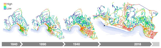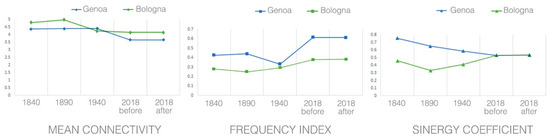 Third, the positive trend of Bologna’s Synergy Coefficient reflects a shift towards a more hierarchically structured system. Conversely, Genoa suffered a progressive decrease of cross-scale spatial accessibility during its expansion process, which may allow us to identify it as a form of urban sprawl. Noticeably, despite their different trends, the two cities had almost the same Synergy Coefficient at the time of the disaster.