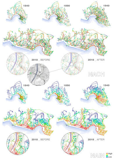 Figure 6 shows some variations in the global distribution of NACH, meaning that the impact of the disaster was higher on the through-movement pattern, due to the loss of an important link of the network’s foreground structure.