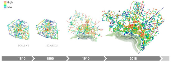 An Angular Segment Analysis (ASA) was adopted because it highlights nuances in configurational metrics’ variations along street segments, and its outputs correlate better with empirical traffic data than those of an Axial Analysis [39]. The analysis process involved the following steps: (1) population of a closed boundary representing the freely accessible space of a city with axial lines [40]; (2) creation of a segment map after breaking the axial lines at their intersecting points and removing the short stubs; (3) ASA analysis performance and export of results in a Geographic Information System (GIS); (4) creation of colour-coded map visualisations in GIS using the standard Space Syntax colour gradient (low values in blue and high values in red) and consistent value classification methods (e.g., quantile and equal count). To produce results that align better with movement patterns during daytime, when tracing the boundary of the 2018 networks, the areas of the two cities limited to vehicular traffic (ZTL) were not included. This analysis method is largely scalable and reproducible [40]. Steps 1 to 3 were automated using DepthmapX [41], a mainstream Space Syntax analysis software, while the calculations were based on a “Tulip analysis 1024 bins”, setting “metric step” as the radius type. In the end, a set of maps displaying the distribution of two basic configurational indices (NACH and NAIN) was produced for every analysed year. These metrics, also known as Normalised Angular Choice and Normalised Angular Integration, measure through- and to-movement patterns, respectively. The use of normalised indices is needed to ensure a rigorous visual comparison of two network systems with a different number of street segments [42].