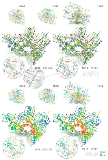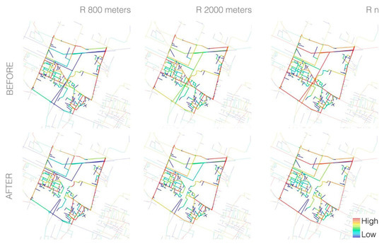Figure 5 and Figure 6 show that Bologna grew significantly after World War II, undergoing a rapid urban development which led to a fusion with its suburban nuclei, initiated in the first decades of the 20th century. Bologna has evolved more coherently than Genoa, as, while expanding, it incremented the number of concentric rings and connected radial roads in line with the spokes-and-hub pattern of the historic city. This pattern is only interrupted in the southern part of the city, due to the presence of a hilly region at the feet of the Apennines. Figure 5, which illustrates the local distribution of NAIN, displays a result similar to that of the global (Rn) analysis displayed in Figure 6. This evidences that the historic centre of Bologna is not merely the repository of a local centrality, but rather the configurational core of the entire urban system. Overall, Bologna presents a good balance between the characteristics of Modularity [51], Diversity and Connectivity. In fact, the foreground network links clusters of strongly connected segments, which are weakly linked to the global network system. This way, the road network “modules” are both independent and accessible. From the analysis it is possible to conclude that Bologna has not been impacted by the collapse of the bridge (located on the west side of the outer ring) as brutally as Genoa—at least partially, because of the better spatial consistency of its road network. In fact, Figure 6 shows that the distribution of NAIN remained practically unaltered after the disaster, and consequently the accessibility and attractiveness of Bologna’s central locations was maintained after the crash.
