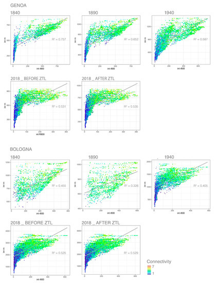The Mean Connectivity and Frequency indices were calculated using simple arithmetic on the results of the ASA, whereas computing the Synergy and Gini coefficients required further processing of the analysis outputs in RStudio. A linear regression between the distribution of the local (R800 m) and global (Rn) Integration Indices of Genoa and Bologna was performed to retrieve the Synergy Coefficients. Figure 8 shows the resulting scatterplots, where points are coloured according to the Connectivity values of the corresponding road segments, together with the regression lines and the associated R2.