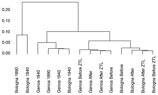 Figure 10 shows the result of the HC analysis used to compare the two retrieved Gini Coefficients (columns 2 and 3 of Table 2), by identifying groups of similar road network patterns in terms of movement distribution. The clusters are defined automatically by the algorithm, by computing and comparing, for each road network pair, the Euclidean distances between the Gini Coefficients, using the complete linkage method. The hierarchical tree or dendrogram resulting from this iterative pairing process confirms some of the observations made in Section 5.2 and Section 5.3. Specifically, the dendrogram shows that the bridge incident has impacted Genoa more than Bologna, especially during the hours when the ZTL was active, because the distance between the Before ZTL and After ZTL situations is higher in the former case, while in Bologna these two configurations are paired early. This distance is less accentuated in Genoa when the ZTL is not active. This correlates well with the documental evidence and confirms previous conclusions about Bologna experiencing a major change between 1890 and 1940, and Genoa undergoing a large transformation between 1940 and 2018. Additionally, the distance between the configuration of Bologna 1940 and Bologna 2018, in Figure 10, corresponds to the second wave of expansion of the city.