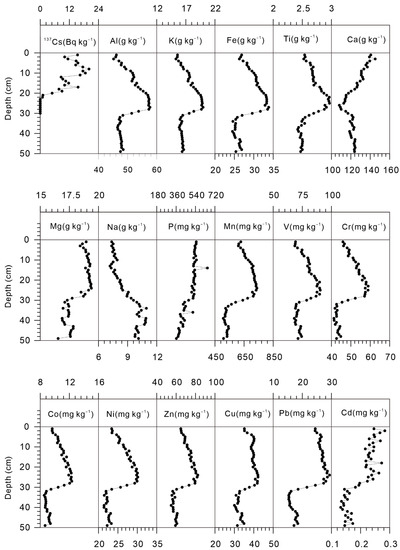 The concentrations of total carbonate and various elements measured in the sediment core are shown in Table 2. The total carbonate concentration ranged from 317.22 to 445.99 g kg−1 with an average value of 360.62 g kg−1. The Al concentration ranged from 45.18 to 57.67 g kg−1, with an average value of 50.62 g kg−1. The concentration of K had a range of 15.30 to 19.96 g kg−1, with an average value of 17.28 g kg−1. The Fe concentration ranged from 24.51 to 33.85 g kg−1, and the Mn concentration from 0 to 28.73 mg kg−1. The Ti concentration ranged from 2.42 to 2.97 g kg−1, with an average value of 2.65 g kg−1. The concentration of Mg had a range of 16.53 to 19.39 g kg−1, with an average value of 18.31 g kg−1. The Na concentration ranged from 7.19 to 10.93 g kg−1, and the P concentration from 362.31 to 650.66 mg kg−1. The concentration of Ca ranged from 108.10 to 145.10 g kg−1. The concentration profiles of elements (Al, K, Fe, Ti, Ca, Mg, Na, P, and Mn) and potentially toxic elements (V, Cr, Co, Ni, Zn, Cu, Pb, and Cd) are shown in Figure 2. Aluminum concentrations were consistent below 30 cm and increased to a maximum value at about 27 cm, then decreased to the top of the core. Most potentially toxic elements, including V, Cr, Co, Ni, Zn, Cu, and Pb, exhibited similar distribution patterns to Al. Calcium concentrations showed an opposite trend to Al. The concentration of Cd was stable below 30 cm and then increased to the top of the core.