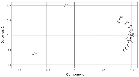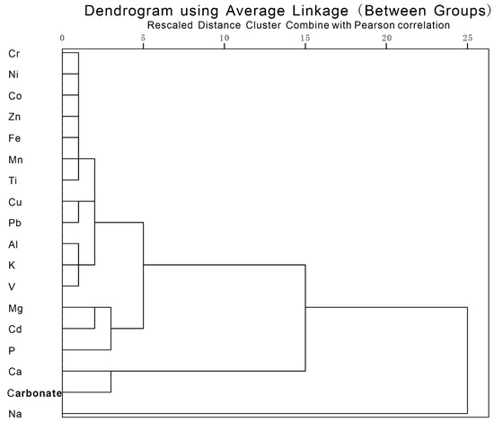 Differences in the sediment concentrations of various elements are the result of their different geochemical behaviors in surface environments and the simultaneous effect of multiple environmental agents [2]. Principal component analysis (PCA) [20,41,42,43] and hierarchical clustering analysis [44,45] were applied to identify influences possibly acting on elements in the sediment core. Using the PCA extraction method, trivial principal components were eliminated and two significant components were obtained, with a cumulative variance of 96.4%. The PCA score plot is shown in Figure 3.