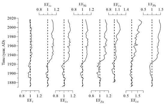 Based on the above analysis, the dominant factor influencing potentially toxic elements in the lake sediments is the physical weathering of terrestrial materials. However, there are usually both natural and anthropogenic sources of potentially toxic elements in lake sediments [48]. Discharges from the metallurgical industry and the combustion of fossil fuels are usually the main sources of Cu, Pb, and Cd [1]. Wastewaters from the Balkhash copper smelting industry and lead–zinc industrial complex as well as contaminants from the thermal power plant and the open-pit mine caused enrichment of potentially toxic elements in Lake Balkhash [18]. The enrichment factor (EF) of potentially toxic elements was calculated to identify anthropogenic influences on the environmental evolution of Lake Balkhash. Based on the EFs, two distinct stages divided by the year 1930 were apparent in the sediment core (Figure 5). During the first stage, the EFs of potentially toxic elements varied in a manner consistent with their concentrations, indicating that these elements are mainly controlled by the sedimentation rate, which correlated with local climate and geological background.