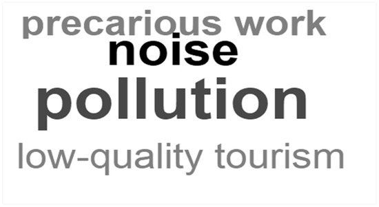 As we can see, ‘pollution’ was the effect most mentioned by residents followed by ‘noise’, ‘precarious work’, and ‘low-quality tourism.’ ‘Noise’ was not included in the ‘pollution’ code because only ‘air pollution’ and ‘environmental pollution’ were mentioned. Tourists’ perspective was represented by two assessments: ‘Pollution’ and ‘no negative impacts’ (68%). The word ‘pollution’ whether it be as an exact match or with generalizations, was mainly mentioned by women.